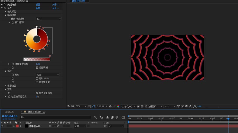 4、通過調(diào)整淡入和淡出的時(shí)間,讓波形從內(nèi)到外有一個(gè)透明度的變化;添加色彩漸變效果,通過色光來實(shí)現(xiàn);添加色光;添加色光效果之后,會發(fā)現(xiàn)不透明度的調(diào)整小時(shí)了,所有顏色都變成了完全不透明了