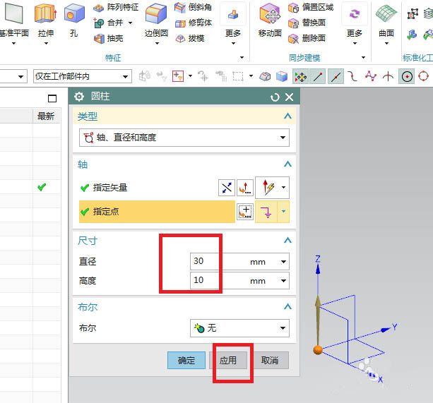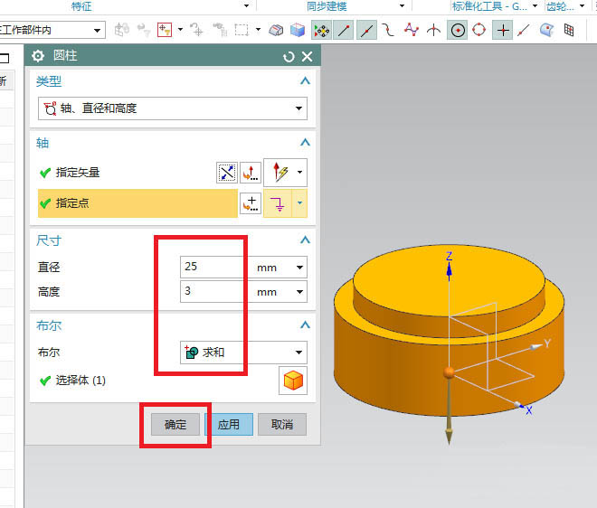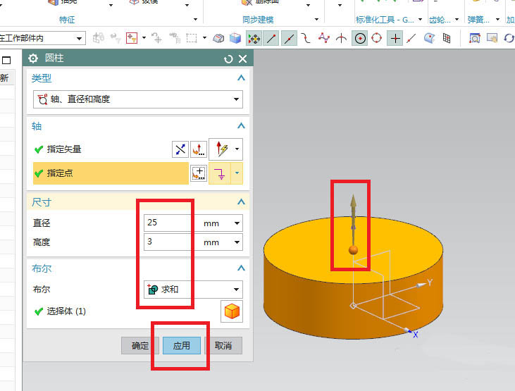 3、如下圖所示,默認(rèn)矢量,指定點(diǎn):0,0,10,設(shè)置尺寸:直徑25,高度3,布爾求和,點(diǎn)擊“應(yīng)用”。