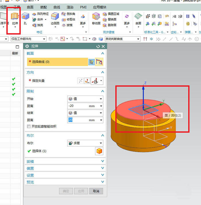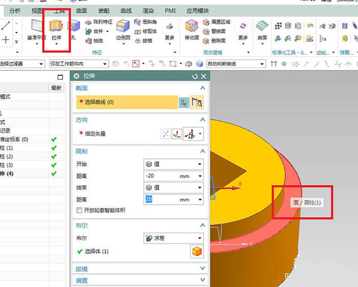 8、如下圖所示,點(diǎn)擊工具欄中的拉伸命令,然后點(diǎn)實(shí)體中的紅色平面。