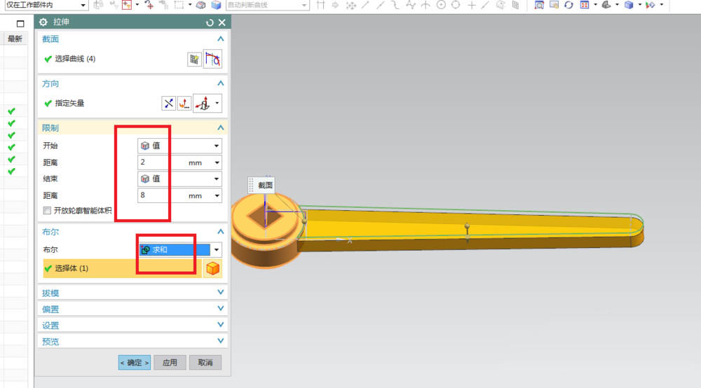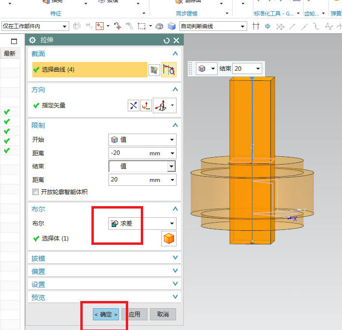 7、如下圖所示,默認(rèn)的限制尺寸可以不用改,布爾求差,點(diǎn)擊確定,一個(gè)方孔就創(chuàng)建完成了。