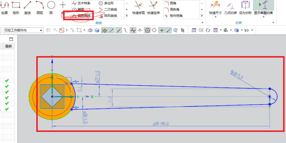 9、如下圖所示,激活投影曲線命令,將實(shí)體的外圓線投影顯示出來(lái),激活直線命令,畫(huà)兩個(gè)線段,成角度,激活圓弧,以兩個(gè)直線段的端點(diǎn)為端點(diǎn)畫(huà)一個(gè)圓弧線段,激活快速修剪命令,按照下圖將整圓修剪成圓弧線段,添加幾何約束,圓弧的圓心點(diǎn)在橫軸上,圓弧線段與兩個(gè)斜線段相切,兩個(gè)斜線段等長(zhǎng),激活快速尺寸命令,標(biāo)注圓弧半徑5,兩個(gè)角度1.5,圓弧圓心距離縱軸140,點(diǎn)擊完成,退出草圖。
