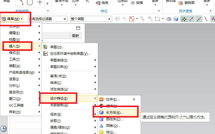 2、如下圖所示,執(zhí)行【菜單——插入——設(shè)計(jì)特征——長(zhǎng)方體】,激活“長(zhǎng)方體”命令。