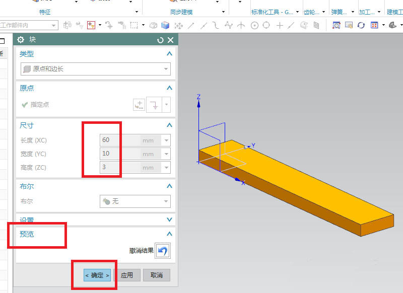 3、如下圖所示,在對(duì)話框中設(shè)置尺寸:60x10x3,點(diǎn)擊預(yù)覽,看著效果點(diǎn)擊確定。