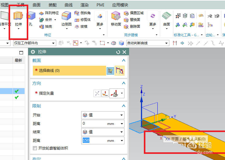 4、如下圖所示,點(diǎn)擊工具欄中的拉伸圖標(biāo),點(diǎn)擊基準(zhǔn)坐標(biāo)系中的XY平面。