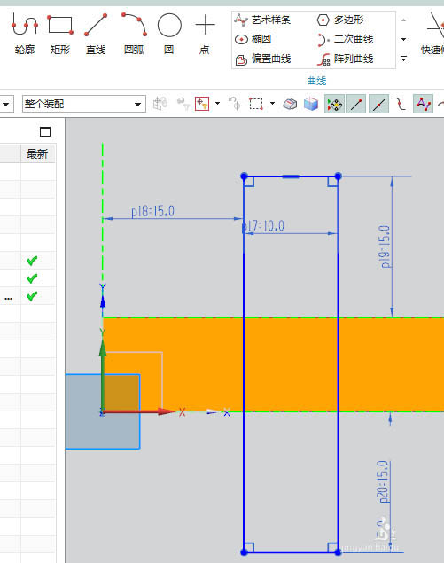 5、如下圖所示,進(jìn)入草圖,激活矩形命令,畫一個(gè)矩形,激活快速尺寸命令,標(biāo)注尺寸確定位置:15、10、15、15,點(diǎn)擊完成,退出草圖。