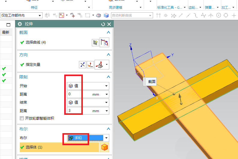6、如下圖所示,回到拉伸對(duì)話框,布爾求和,設(shè)置限制為:從0開始,3結(jié)束,點(diǎn)擊確定。