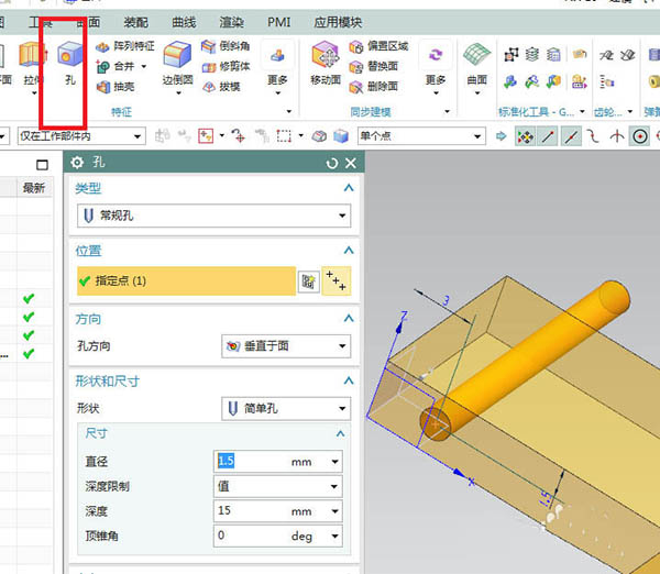 7、如下圖所示,點(diǎn)擊工具欄中的孔圖標(biāo),激活孔命令,點(diǎn)擊長(zhǎng)方體的一個(gè)側(cè)面,進(jìn)入草圖確定點(diǎn)的位置,設(shè)置尺寸:直徑1.5,點(diǎn)擊確定。