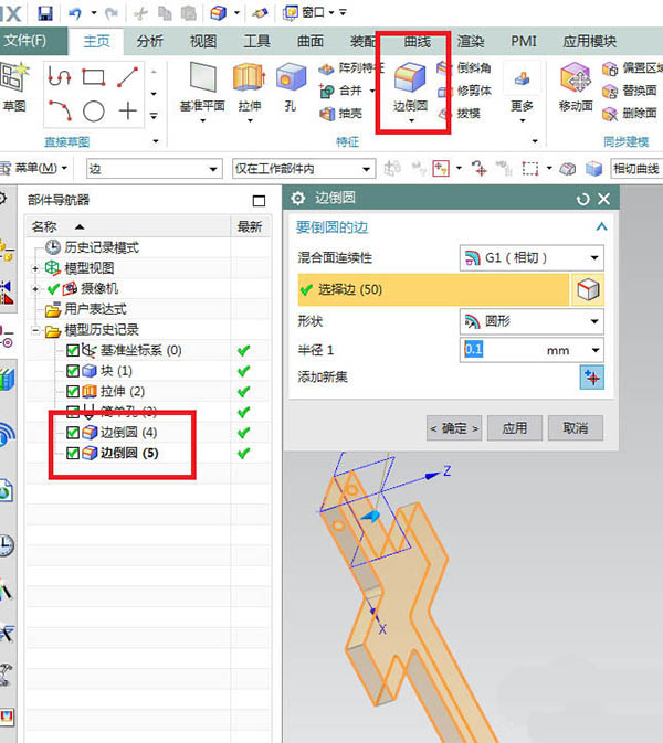 8、如下圖所示,點(diǎn)擊工具欄中的邊倒圓命令,點(diǎn)擊實(shí)體中的實(shí)體邊線,對(duì)話框中設(shè)置半徑,點(diǎn)擊確定。按照這個(gè)步驟完成多次邊倒圓操作。