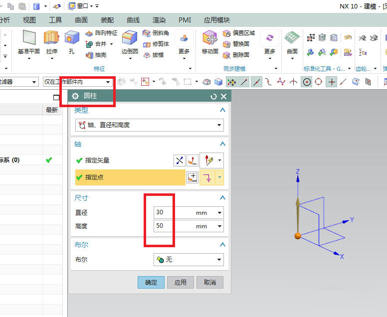 2、如下圖所示,執(zhí)行【菜單——插入——設(shè)計特征——圓柱體】,軸默認(rèn),設(shè)置尺寸:直徑30,高度50,點擊確定。