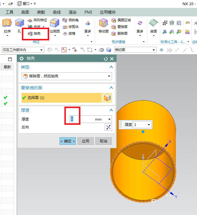 3、如下圖所示,點擊工具欄中的抽殼圖標(biāo),點擊圓柱體的底面,設(shè)置厚度1,點擊確定。