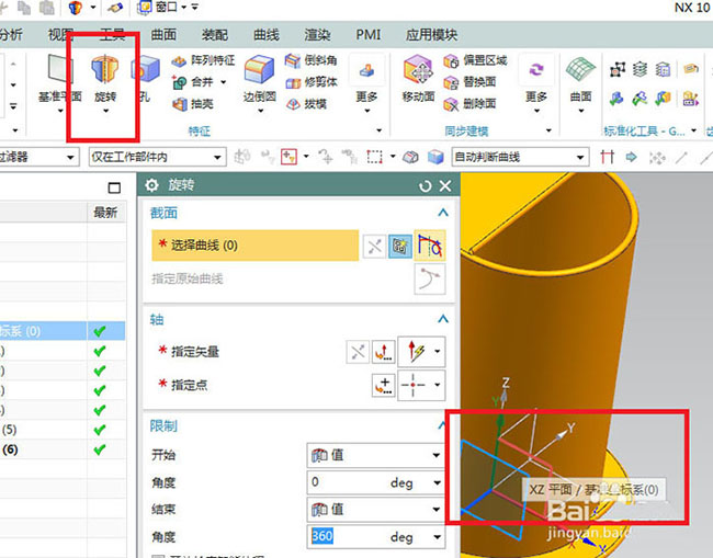9、如下圖所示,點擊工具欄中的旋轉(zhuǎn)圖標(biāo),點擊基準(zhǔn)坐標(biāo)系中的XZ平面。
