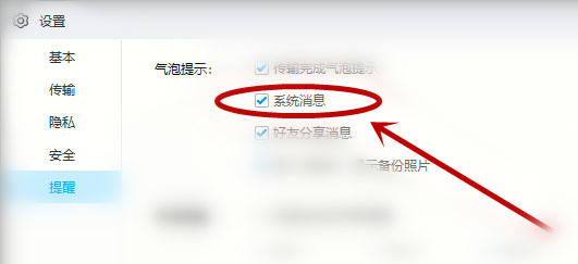 5、在右邊窗口,選擇【氣泡提示】選項組中的【系統(tǒng)消息】選項。該選項默認(rèn)是勾選打開的