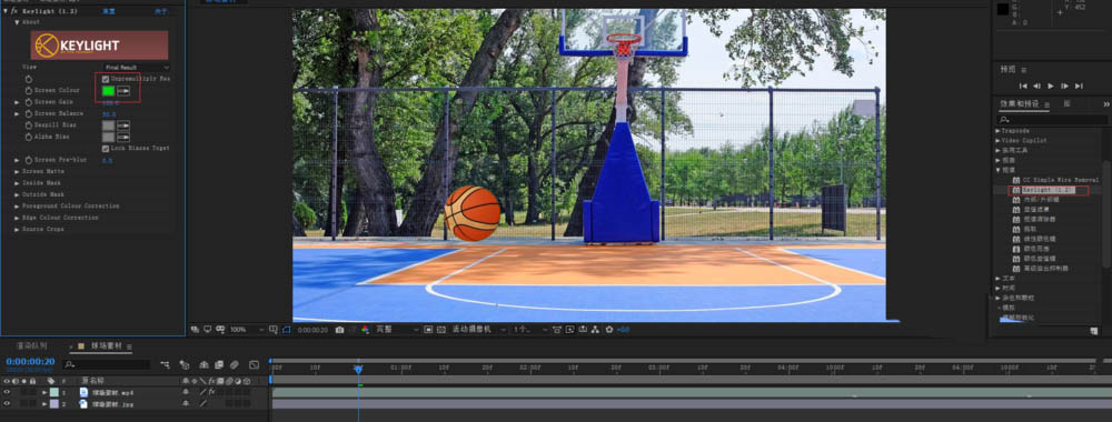 3、點擊籃球素材——效果和預設面板——摳像——keylight——吸管——吸籃球素材綠色位置