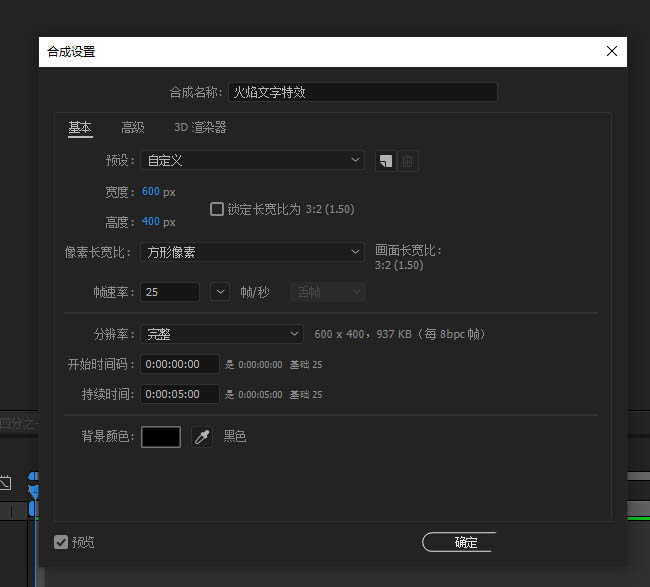 1、打開AE軟件,命名火焰文字特效,調(diào)整相應的參數(shù)。
