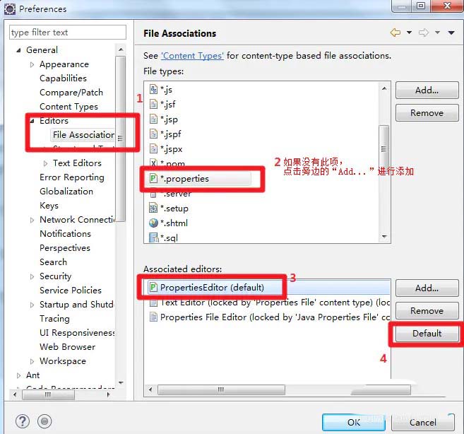 7、配置“*.properties”文件默認(rèn)使用剛剛安裝的插件PropertiesEditor進(jìn)行關(guān)聯(lián)打開(kāi)。點(diǎn)擊Eclipse菜單Window > Preferences > General > Editors > File Associations,在“File Associations”頁(yè)面,配置文件類型為“*.properties”的文件的關(guān)聯(lián)編輯器為PropertiesEditor