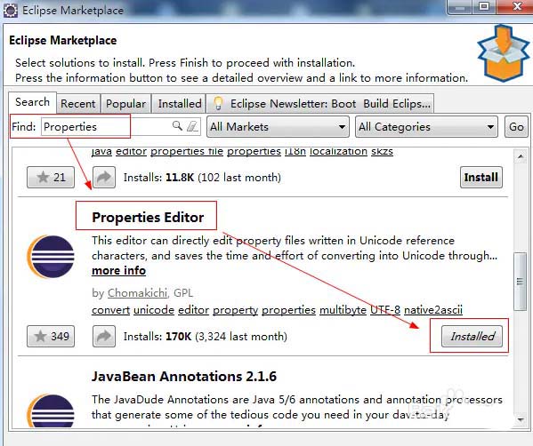2、在Search標(biāo)簽頁(yè)中,輸入“Properties”關(guān)鍵字進(jìn)行匹配查找,會(huì)發(fā)現(xiàn)有一款叫“Properties Editor”的插件,點(diǎn)擊“Install”按鈕進(jìn)行安裝。