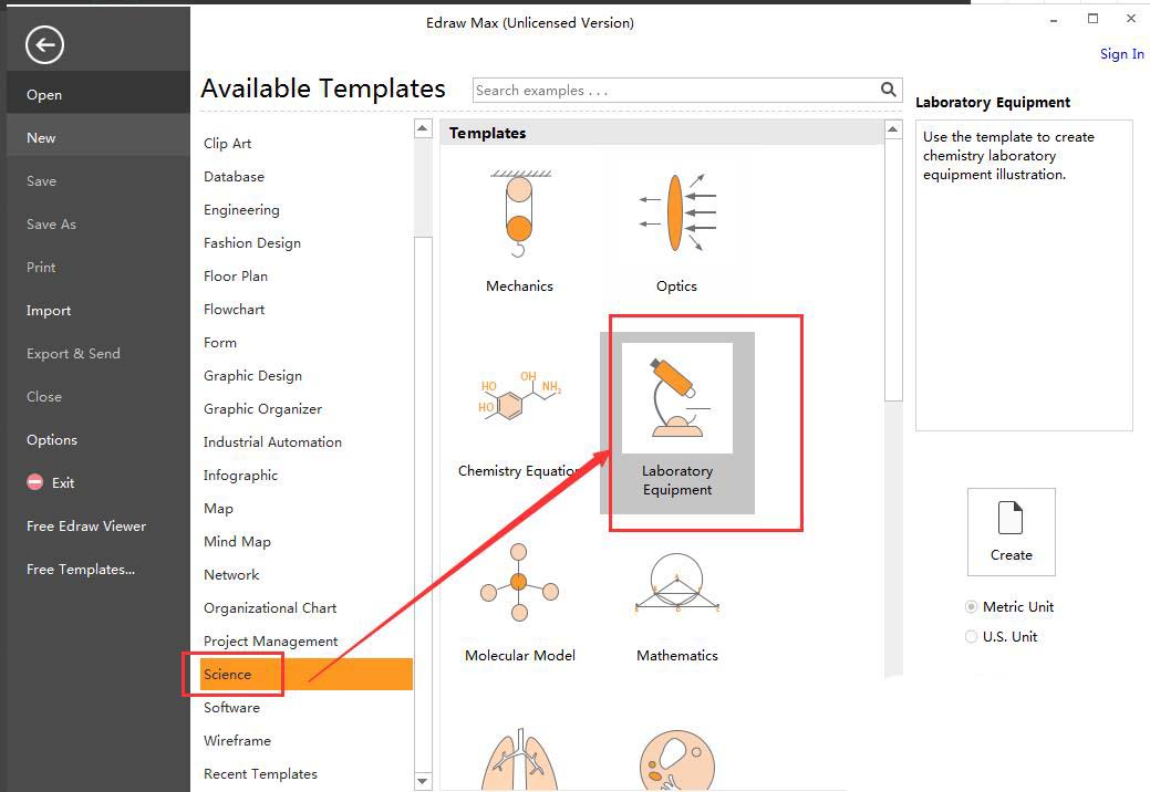 1、打開Edraw Max,在科學(xué)中雙擊實(shí)驗(yàn)儀器;