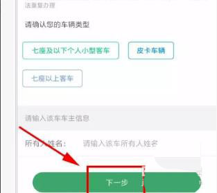 4、驗(yàn)證后選擇辦理銀行,在銀行中選擇“農(nóng)商銀行”,填寫(xiě)車(chē)輛信息及車(chē)主信息,在點(diǎn)擊“下一步”。