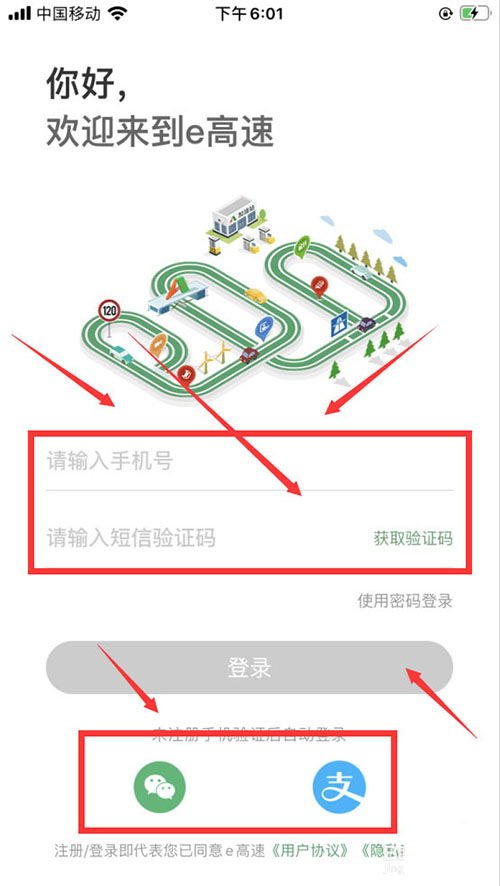 1、首先車(chē)主持身份證、行駛證、銀行卡開(kāi)車(chē)到就近銀行網(wǎng)點(diǎn),下載“e高速”App,打開(kāi)后輸入手機(jī)號(hào)獲取驗(yàn)證碼登錄,或通過(guò)微信、支付寶登錄都可以。