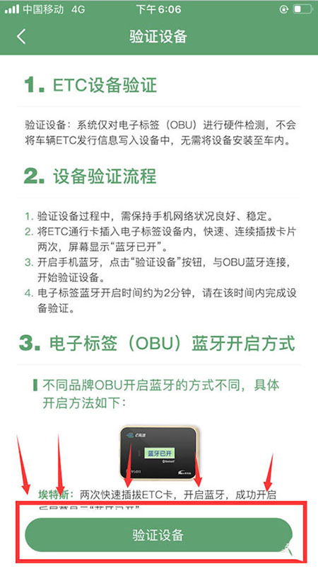 3、隨后選擇“ETC現(xiàn)場(chǎng)辦理激活”,根據(jù)提示,打開(kāi)手機(jī)藍(lán)牙、OBU設(shè)備藍(lán)牙,在點(diǎn)擊“驗(yàn)證設(shè)備”。