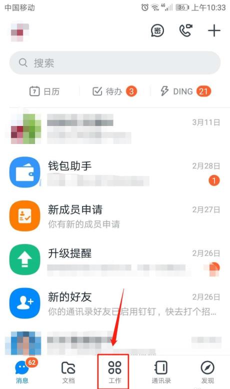 1、運(yùn)行手機(jī)釘釘并登錄,點(diǎn)擊頁面下方中間“工作”圖標(biāo)。