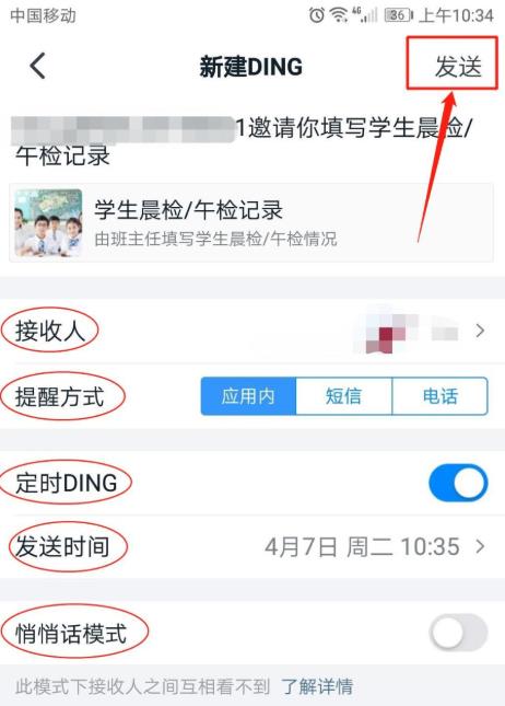 6、設(shè)置接收人、提醒方式和發(fā)送時(shí)間等選項(xiàng),根據(jù)個(gè)人需要開啟/關(guān)閉定時(shí)DING、悄悄話模式等功能,然后點(diǎn)擊頁面右上角“發(fā)送”即可。