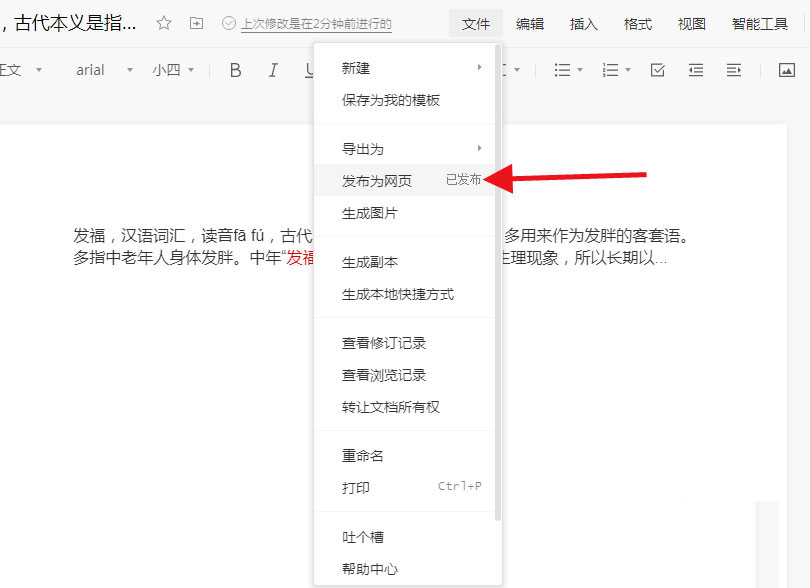 3、點(diǎn)擊下拉菜單中的“發(fā)布為網(wǎng)頁 已發(fā)布”。