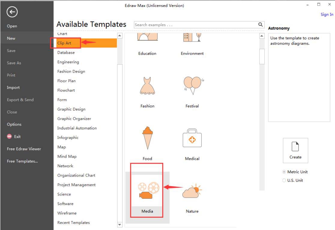 1、打開Edraw Max,在剪切畫中雙擊媒體;2