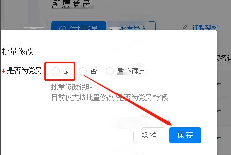 5、在彈出的菜單中按照是否黨員選擇是或者否,然后保存。