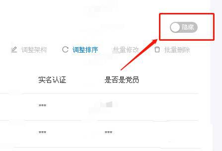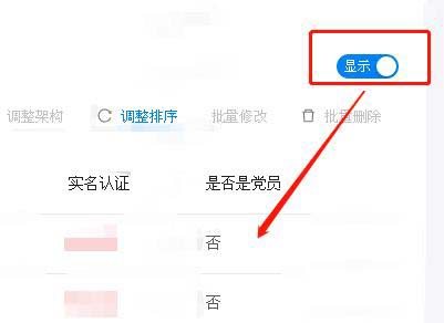 7、若要查看信息,可在所屬黨員頁面,將右側(cè)的“隱藏”點為“顯示”即可。