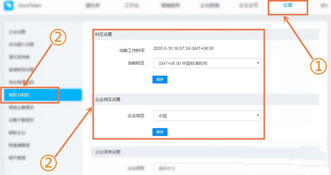 5、進入打開的新窗口頁面,在頂部的導航欄打開“設置”,然后在左側的導航欄下,找到“地區(qū)與時區(qū)”,然后就可以進行時區(qū)與企業(yè)地區(qū)的設置了。