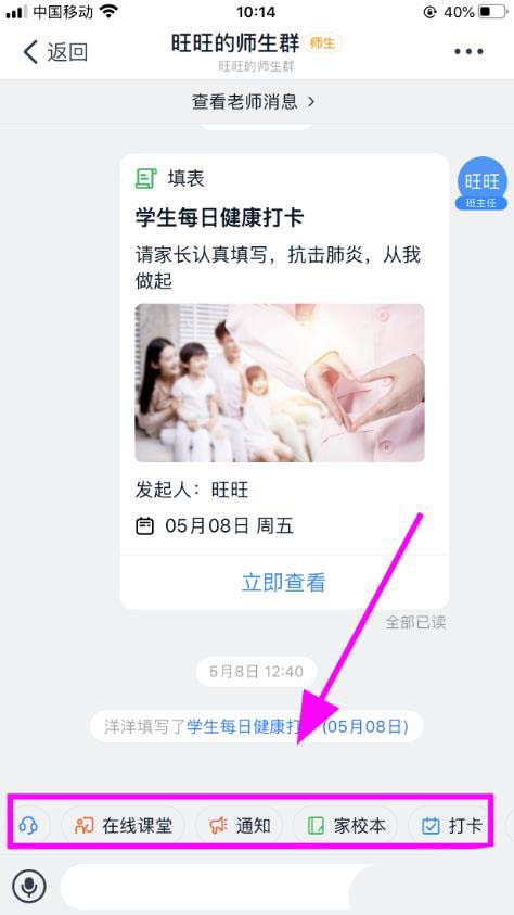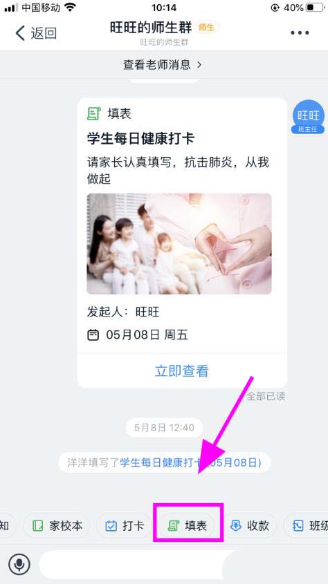 2、進(jìn)入師生群,向左滑動(dòng)底部的快捷鍵,點(diǎn)擊【填表】功能;