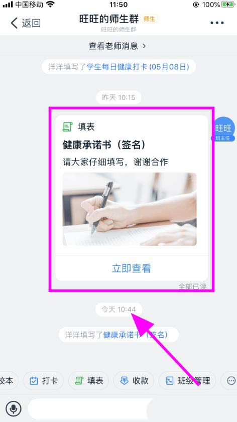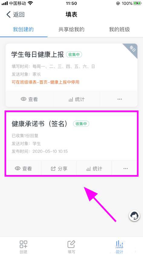 6、成功發(fā)布【學(xué)生返校健康承諾書簽字版】,可以在消息中和統(tǒng)計(jì)中看到此項(xiàng)表格;