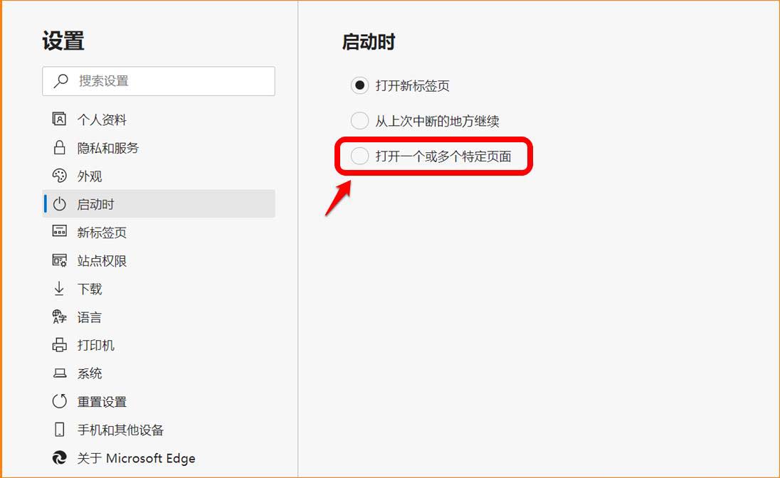 5、在對應(yīng)的右側(cè)窗口中,我們點(diǎn)擊:打開一個或多個特定頁面;