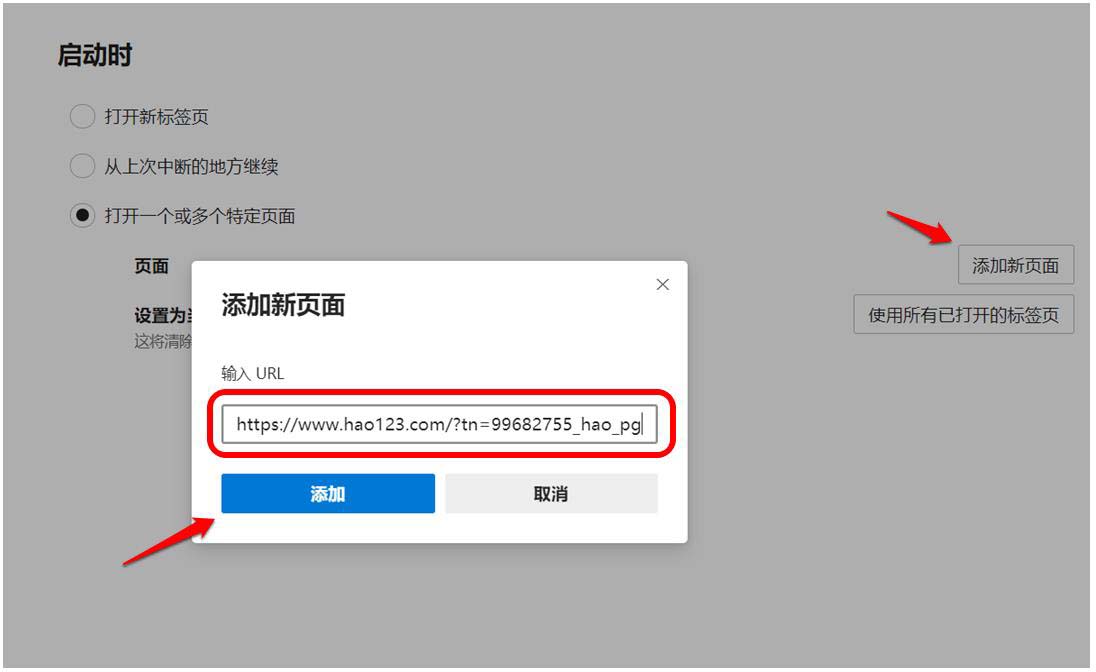 7、點(diǎn)擊【添加新頁面】按紐,將復(fù)制的 URL 粘貼到 添加新頁面 的對話框中,再點(diǎn)擊:添加;