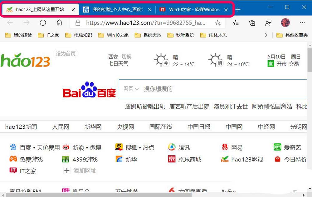 15、重啟Microsoft Edge瀏覽器,我們即可看到同時啟動了特定設置的三個網(wǎng)頁頁面。