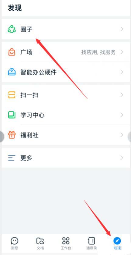 1、打開釘釘點(diǎn)擊下方的【發(fā)現(xiàn)】按鈕選擇【圈子】。