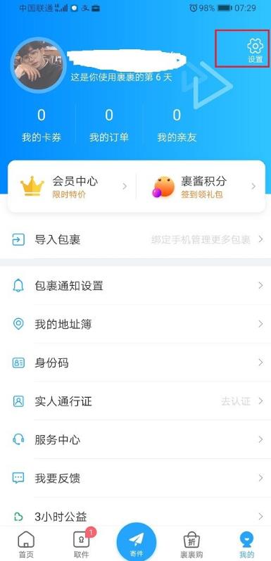 1、打開菜鳥裹裹,進(jìn)去我的界面,點(diǎn)擊設(shè)置,如下圖所示: