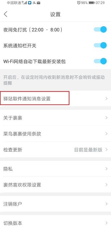 2、在設(shè)置界面,點(diǎn)擊驛站取件通知消息設(shè)置,如下圖所示: