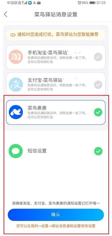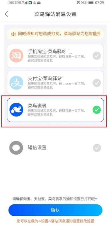 5、可以看到已經(jīng)成功設(shè)置菜鳥驛站短信通知了,如下圖所示:
