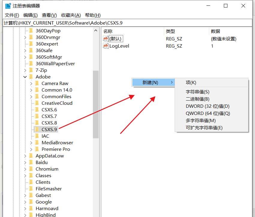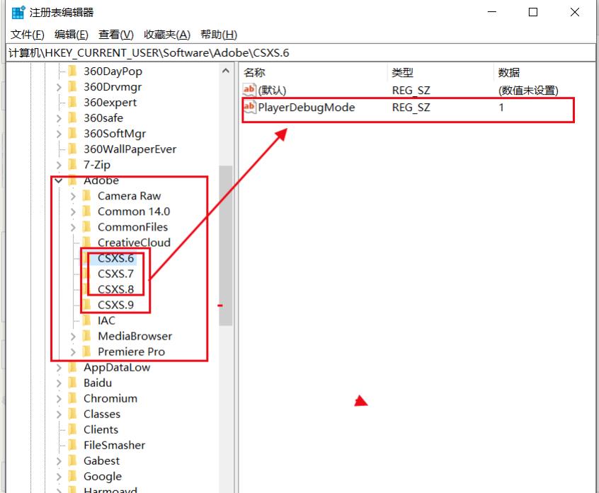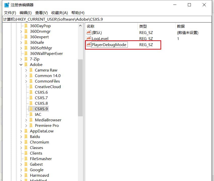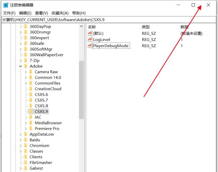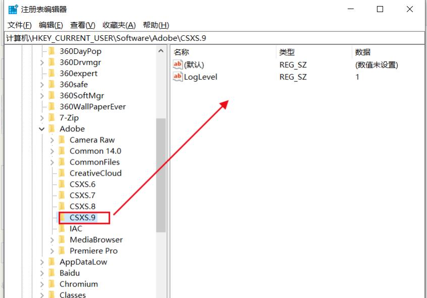 - 再注冊(cè)列表地址欄輸入:計(jì)算機(jī)\HKEY_CURRENT_USER\Software\Adobe\CSXS.9