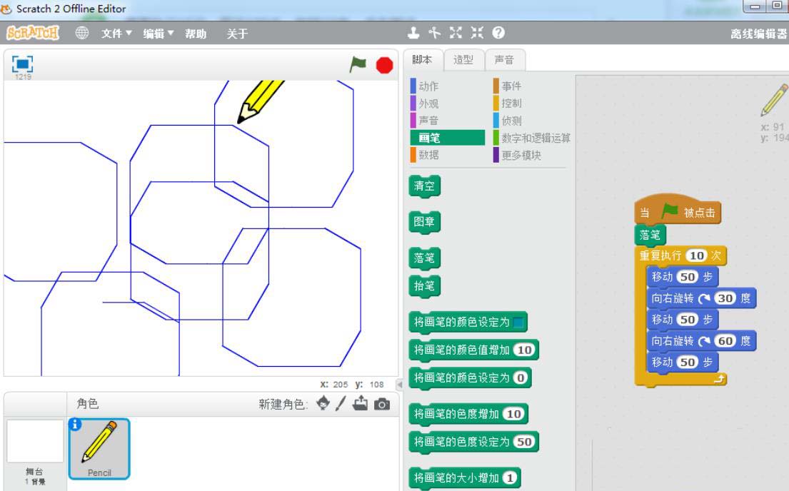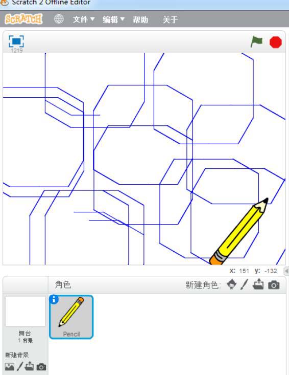 5、接下去,重復點擊綠旗畫圖,產(chǎn)生抽象畫效果。畫筆移動一點角度,產(chǎn)生藝術畫,