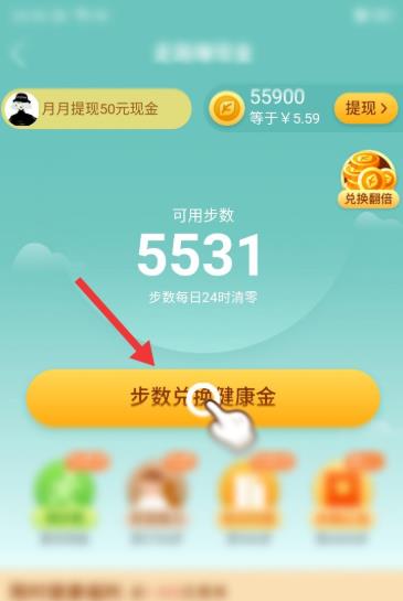 4、點擊后,點擊【步數(shù)兌換健康金】,即可實現(xiàn)步數(shù)變現(xiàn)。