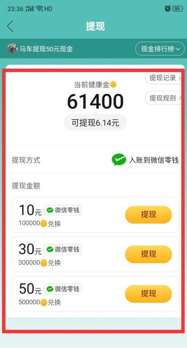 5、然后點擊右上角的【提現(xiàn)】,可以看到健康金兌換的規(guī)則,10萬健康金等于10元,30健康金等于30元等,注意的是,要累積到10萬健康金才可以提現(xiàn)。