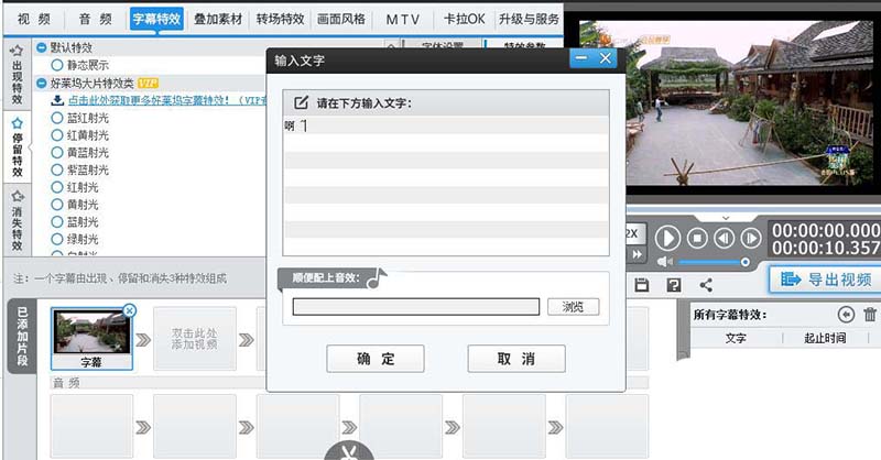 3、上方的菜單欄中選擇字幕特效;雙擊要在視頻界面添加字幕的位置;在彈出來(lái)的文字輸入框中輸入文字;文字輸入好后,點(diǎn)擊確定。