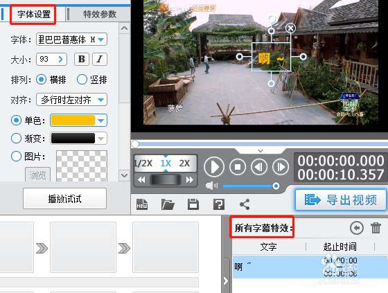 4、在右下角的所有字幕特效欄選中添加的字幕,在字體設(shè)置欄調(diào)整字體的顏色和大小。