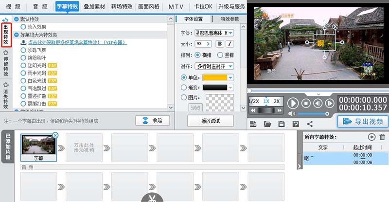這里以出現(xiàn)特效里的“搖晃”為例。在字幕特效的左側(cè)選擇出現(xiàn)特效。
