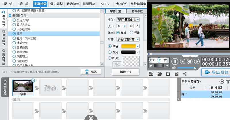 6、選擇新奇類特效中的搖晃,會(huì)看到右側(cè)視頻界面有該特效的預(yù)覽效果,點(diǎn)擊播放試試,字幕的顫抖效果就加好了,快去試試吧。
