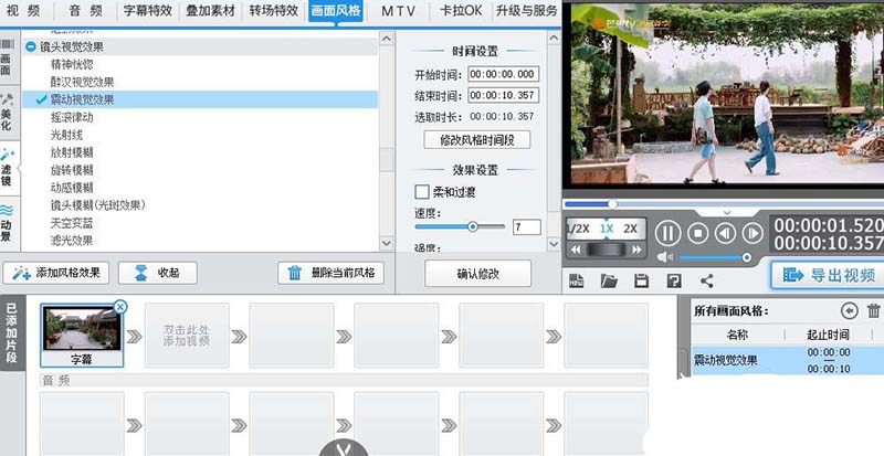 5、點(diǎn)擊添加風(fēng)格效果,選擇為當(dāng)前片段添加風(fēng)格,也可以選擇為指定時(shí)間段添加風(fēng)格,點(diǎn)擊確認(rèn)修改,會(huì)看到視頻畫面抖動(dòng)效果已經(jīng)制作完成。