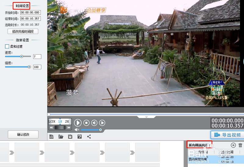6、在右下角的所有畫面風(fēng)格欄,可以看到添加的畫面風(fēng)格;選中畫面風(fēng)格,在時(shí)間設(shè)置欄可以調(diào)整風(fēng)格開始和結(jié)束的時(shí)間;在效果設(shè)置欄還可以該調(diào)整風(fēng)格的效果。